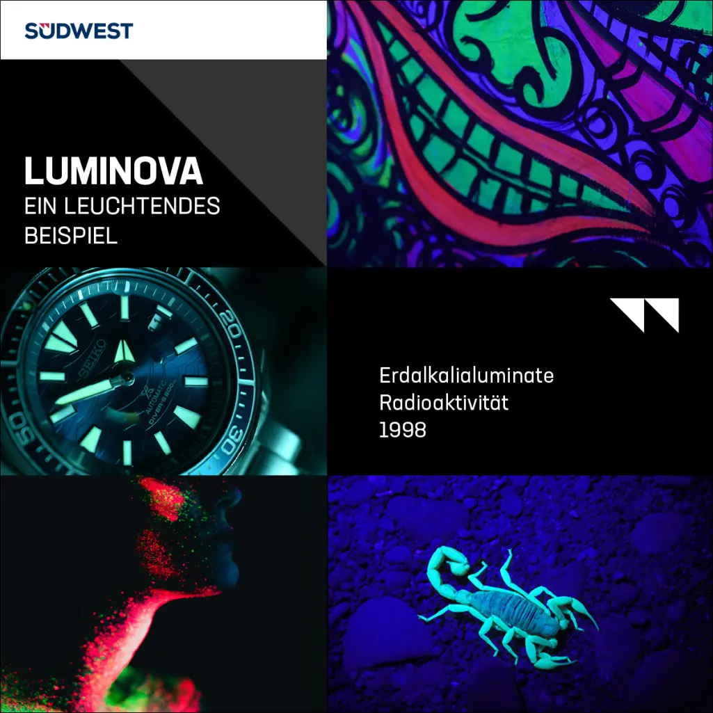 Luminova is a strontium aluminate-based afterglow pigment developed by the Japanese company Nemoto & Co Ltd. in 1998. The substance stores natural and artificial light and emits this over a longer period of time. The glow is the result of inorganic phosphorescence. The electrons are set to a higher energy level when the light enters and a glow arises when these are reset.