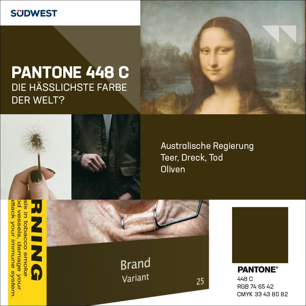 The survey revealed that Pantone 448C, also known as “opaque couché”, evoked nearly exclusively negative associations, such as dirt, tar, or death. Initially, the Australian health minister referred to the colour shade as “olive green”, but the Australian Olive Association stepped in to avoid associations with the colour.