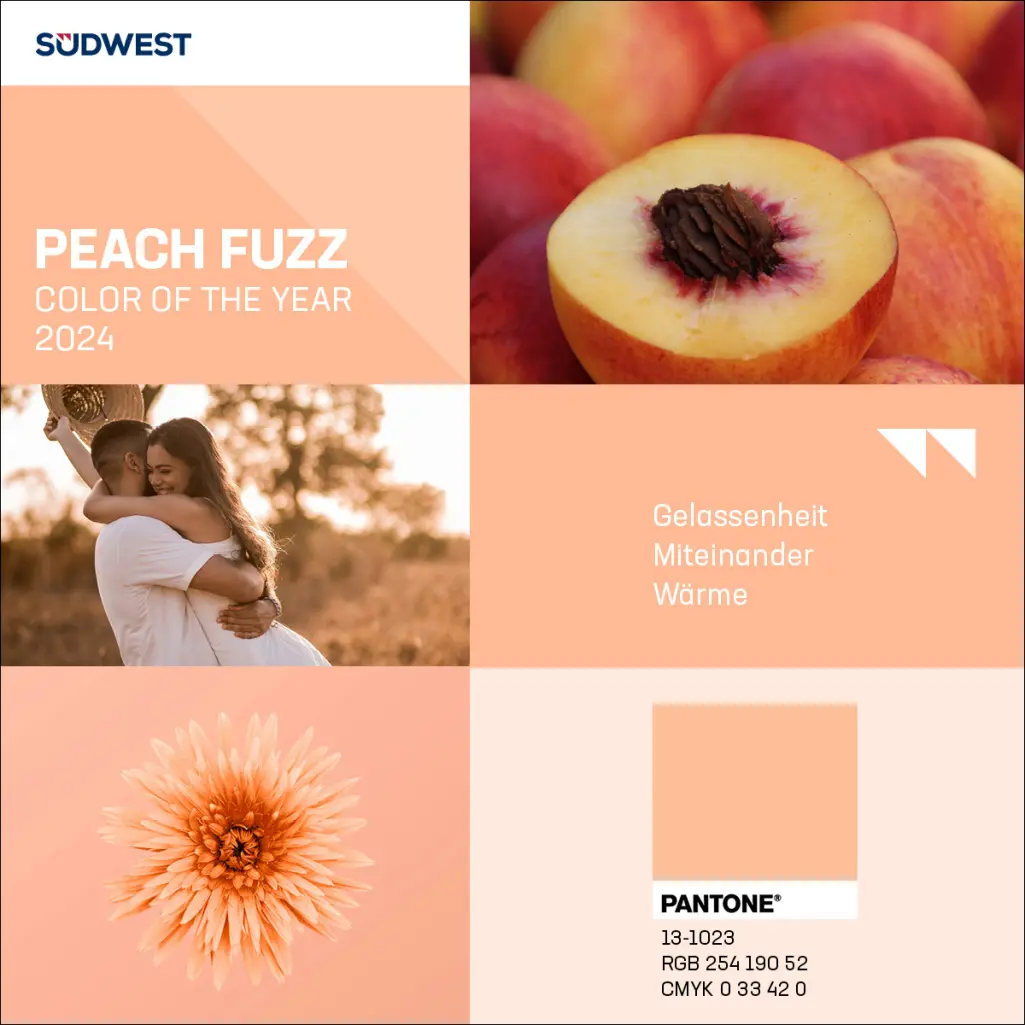 The Pantone Color of the Year 2024 is Peach Fuzz, a soft and warm peach tone designed to convey a sense of calm, well-being, and security.This choice of colour reflects design and societal trends, which are moving towards a need for harmony, slowing down, and well-being.The colour describes human interactions, such as embracing a loved one or having a good time with friends. In a time where people are judged by their external achievements, Peach Fuzz is designed to symbolise a shift in priorities towards internal well-being.