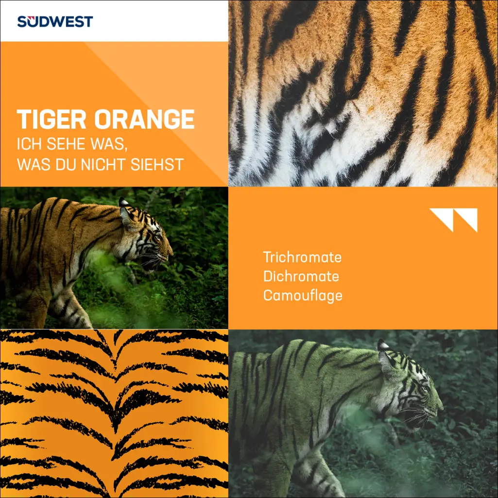 Trichromats, like humans, can clearly differentiate between three colours – red, green, and blue. For us, a tiger’s fur therefore looks like a vibrant orange with black stripes. In addition to its colourful camouflage, the tiger’s stripes help it to blur its contours. In the tiger’s natural habitat, made up of dense undergrowth, high grass, and ever-changing light, the stripes break up its body profile and make it more difficult to detect. The combination of the different way its prey perceives colours and the effective camouflage pattern make the tiger one of the best hunters on the planet, despite its coat looking orange to us.